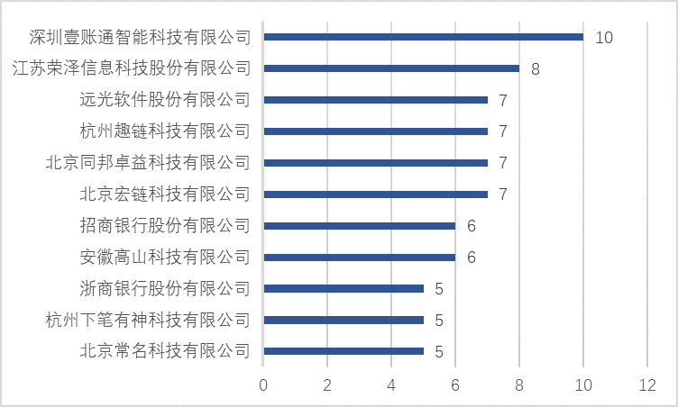 其中,深圳壹账通智能科技有限公司备案信息多达10条,是通过备案数量最大的主体。除此之外,江苏荣泽信息科技股份有限公司(8条)、远光软件股份有限公司(7条)、杭州趣链科技有限公司(7条)、北京同邦卓益科技有限公司(7条)、北京宏链科技有限公司(7条)、招商银行股份有限公司(6条)、安徽高山科技有限公司(6条)、浙商银行股份有限公司(5条)、杭州下笔有什科技有限公司(5条)和北京常名科技有限公司(5条)等11家企业有5个或5个以上项目通过网信办备案。
