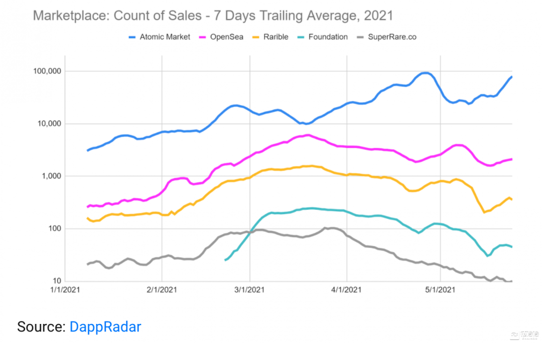 NFT交易平台Atomic Market就是一个很好的例子。尽管其平台代币WAXP的价格不断下降,但该平台上的交易仍在继续。此外,以太坊区块链上的平台,如OpenSea和Rarible,受到了gas费上涨的影响,交易量出现短时下降。当gas费恢复正常后,平台上的交易活动再次增加,因为收藏者在寻找打折的NFT。