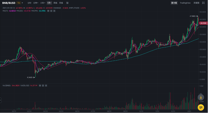 销毁当日,BNB开盘价为45.4美元,以42.5美元报收,最高价为47.1美元。