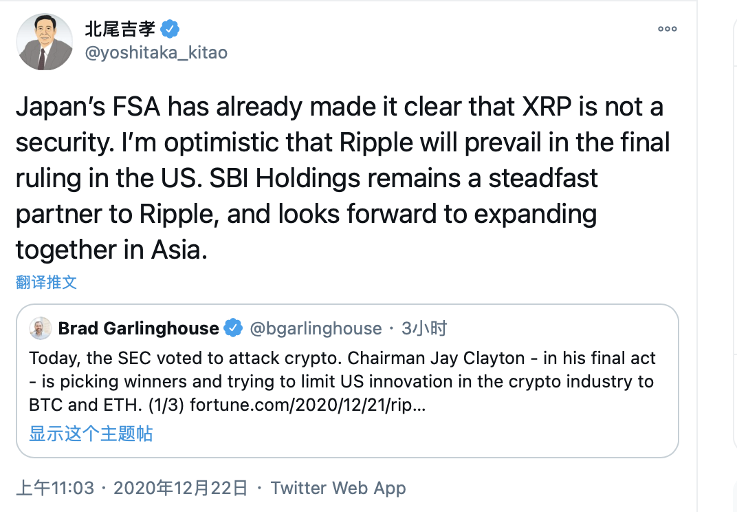 投资Ripple的日本金融巨头SBI Holdings总裁北尾吉孝今日在推特表示:“日本金融厅已经明确表示XRP不是证券。我乐观地认为,Ripple将在美国的最终裁决中占上风。SBI Holdings仍然是Ri称e的坚定合作伙伴,并期待着在亚洲共同扩展。”