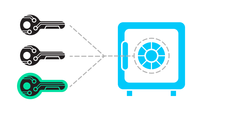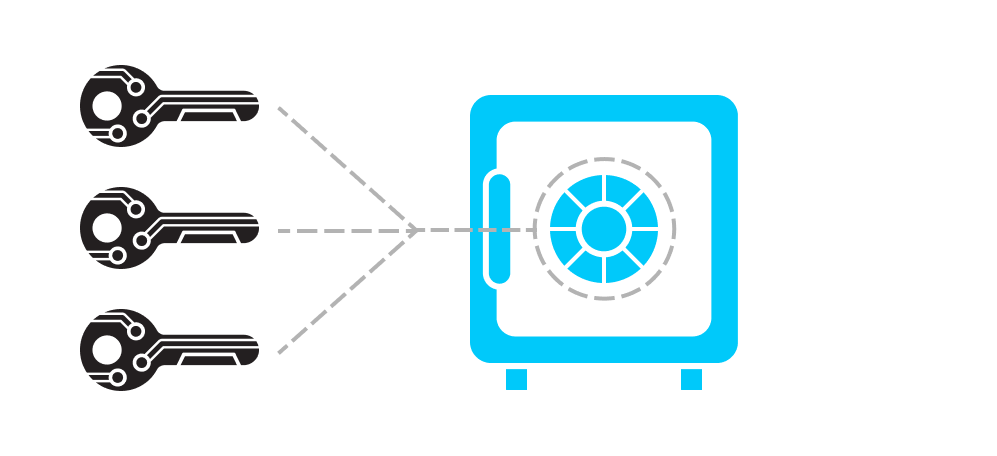 如果单签名钱包相当于一个拥有黄金金库的单一钥匙,那么多签钱包就像一个拥有一定数量私钥(M)的保险箱,需要一定数量的私钥(N)来打开这个盒子。
