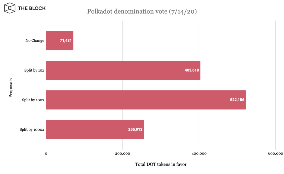从目前的投票情况来看,改变其面额似乎是有可能的,因为大约94%的人投票支持做出某种面额的改变,使其供应量变得更多。目前最受欢迎的方案是将1个DOT分成100份,获得了大约42%的投票。第二种最受欢迎的方案是将1个DOT分成10份,约占32%。
