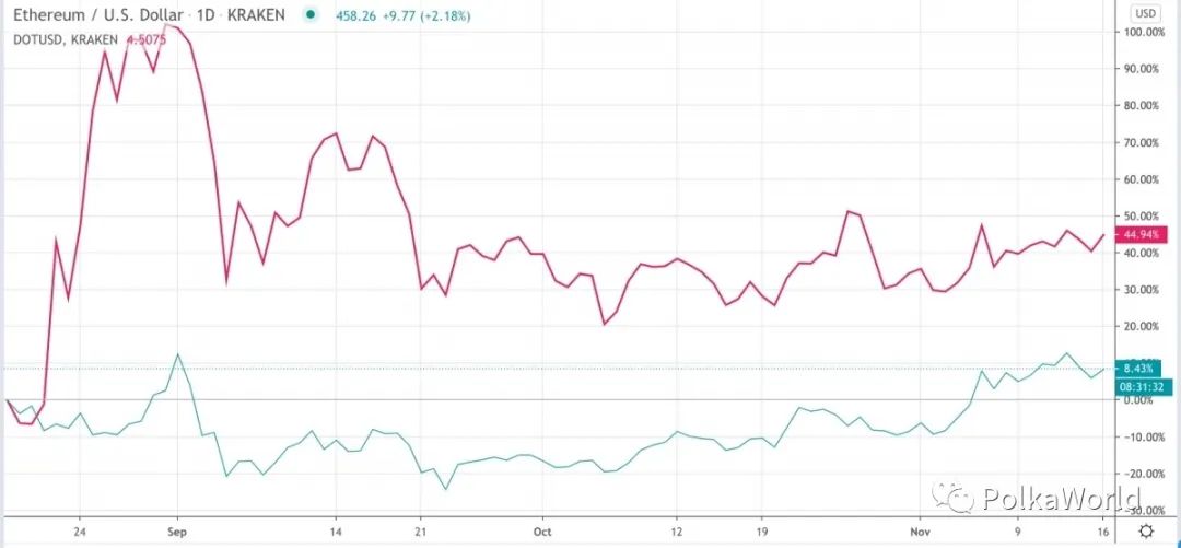 自 8 月 18 日 DOT 在 Kraken 上交易以来,DOT(紫红色)与ETH(蓝色)的比较。资料来源:TradingView