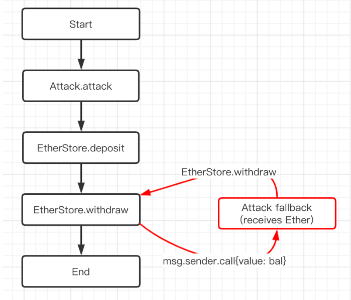 5. 当 Attack.attack 调用 EtherStore.withdraw 提取了先前 Eve 充值的 1 个以太时会触发 Attack.fallback 函数。这时只要 EtherStore 合约中的以太大于或等于 1 Attack.fallback 就会一直调用 EtherStore.withdraw 函数将 EtherStore 合约中的以太提取到 Attack 合约中,直到 EtherStore 合约中的以太小于 1 。这样攻击者 Eve 会得到 EtherStore 合约中剩下的 2 个以太币(Alice、Bob 充值的两枚以太币)。