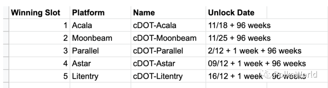 cDOT 可以在项目平行链租期结束后以 1:1 的比例兑换成 DOT。cDOT 会在Parallel parachain 上线后发行,同时他们也将根据所投 crowdloan 项目被命名,举个例子: