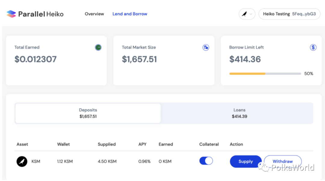 通过质押 cDOT 到我们的借贷市场,用户可以将 cDOT 作为抵押物来借出资产。目前,我们只支持借出 DOT 资产。