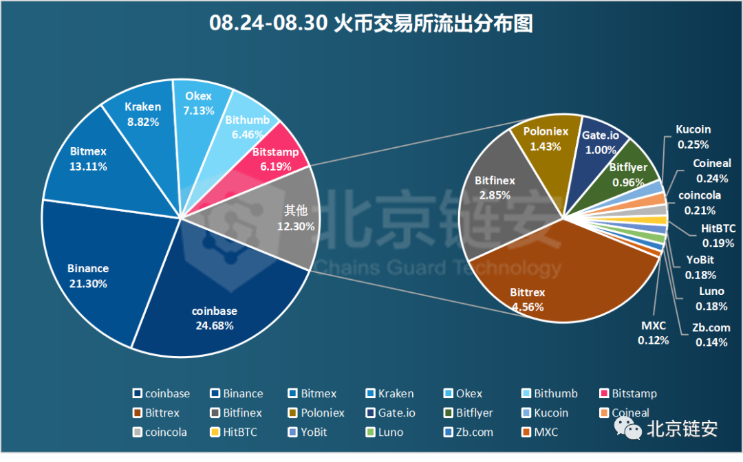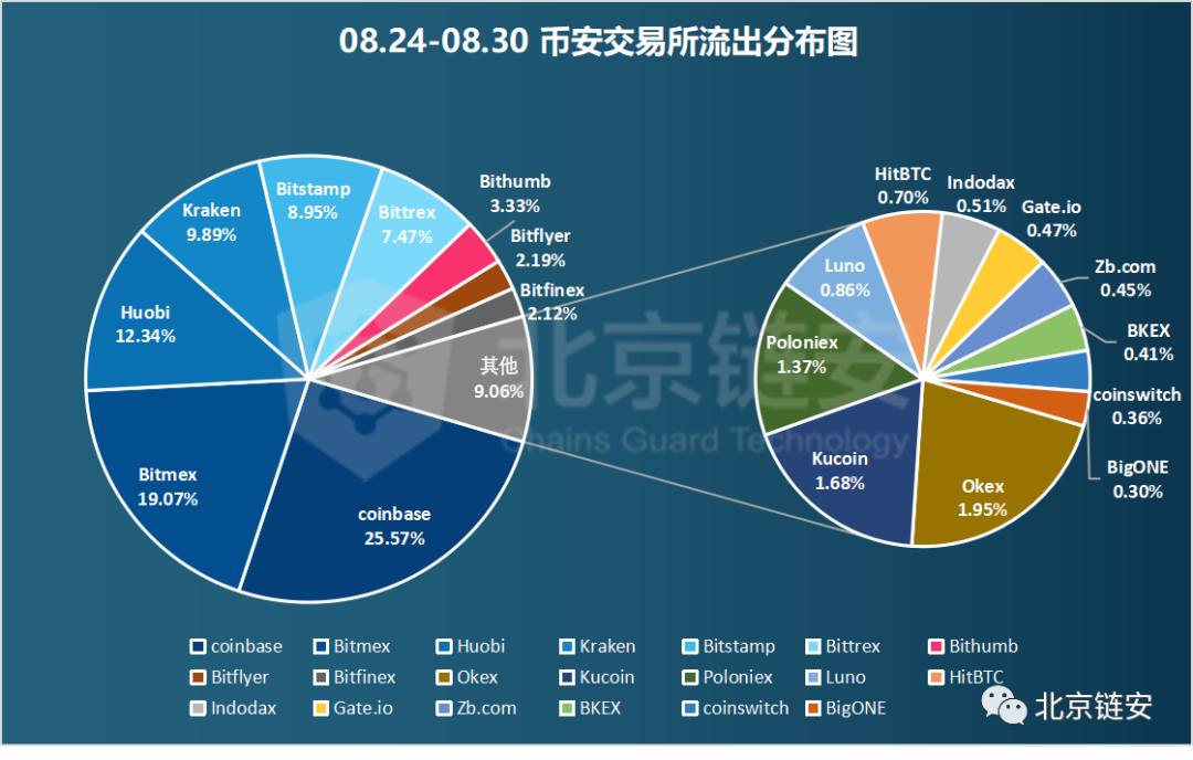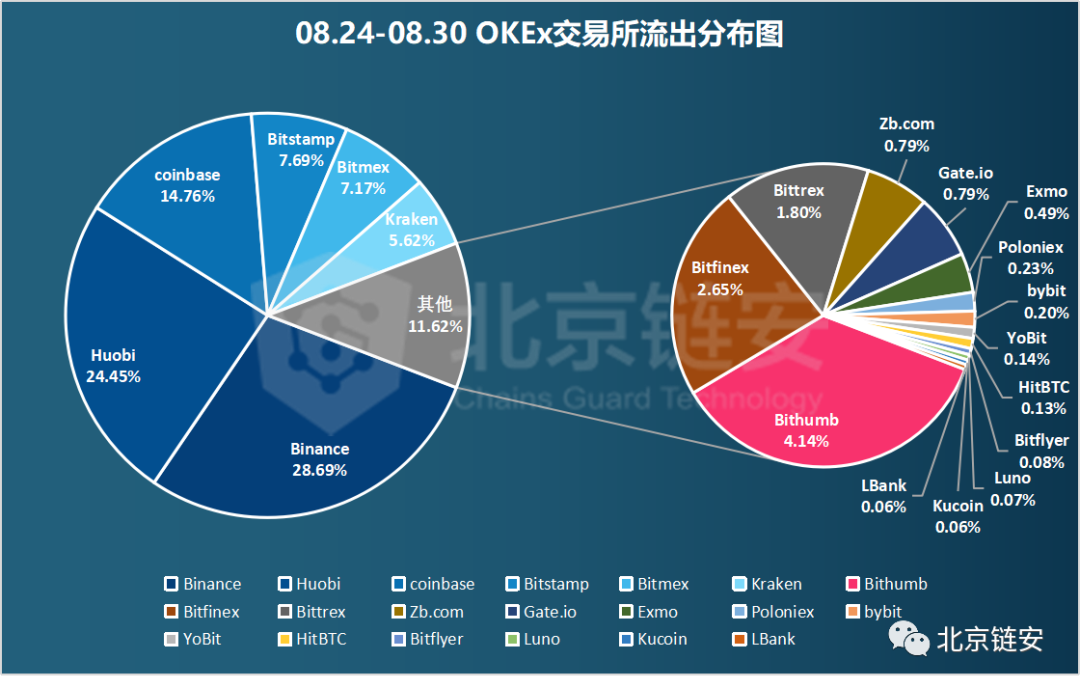 在过去一周,交易所之间的比特币来往又呈现怎样的分布呢?我们将币安、火币、OKex三大交易所流出到各交易所的比例在这里也向各位呈现。