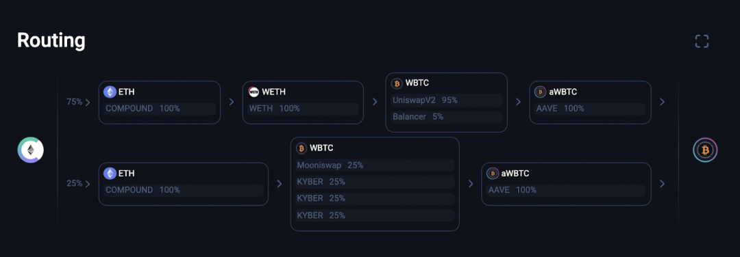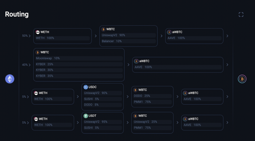 Pathfinder使用不同的“市场深度”作为源代币和目标代币之间的桥梁。因此,该算法使用了一种更为复杂的方法,而不仅仅是在不同的协议之间分割交换。此外,它还可以在同一协议的不同“市场深度”之间分割特定协议的部分交换,为用户获得最佳兑换率,同时考虑到了gas消耗。