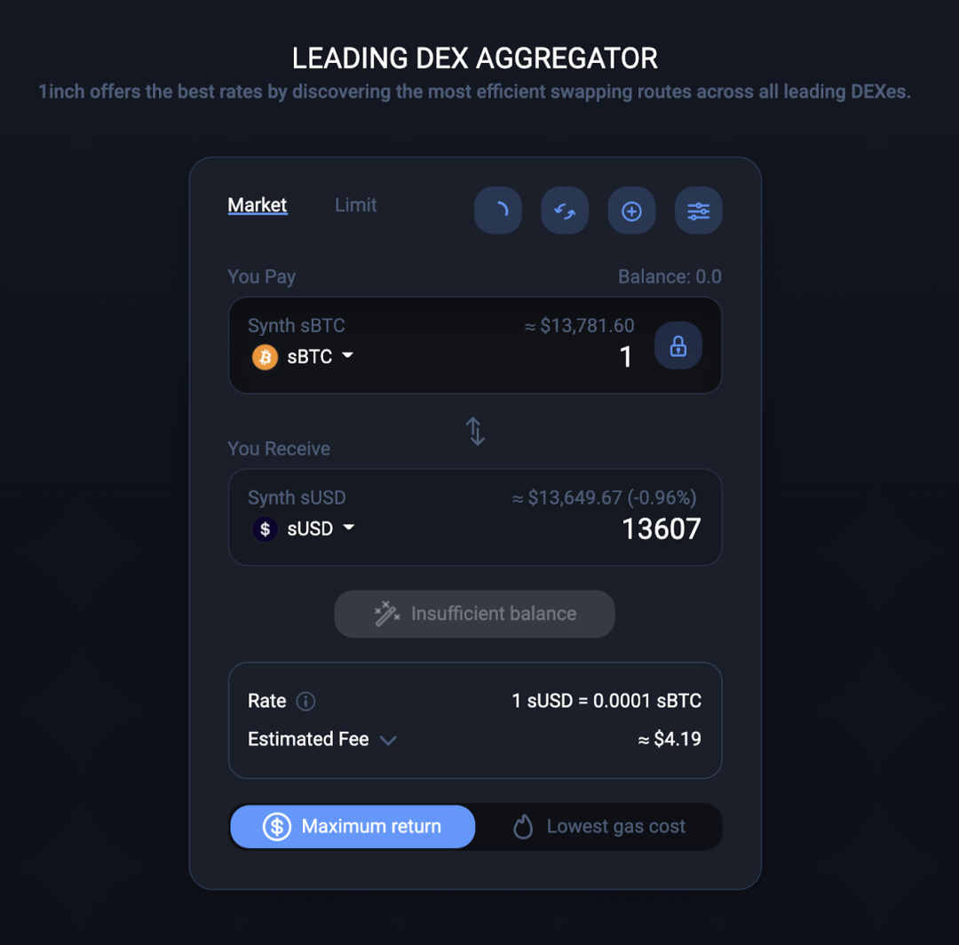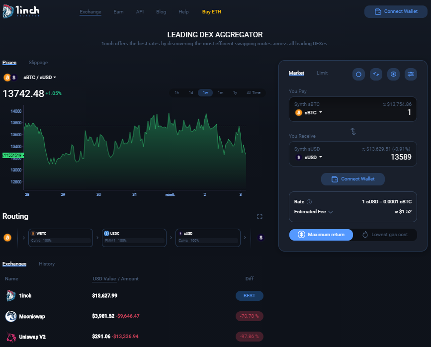 由于改进了报价,在1inch上交换1 sBTC-sUSD的汇率,要比在Uniswap上高出很多。