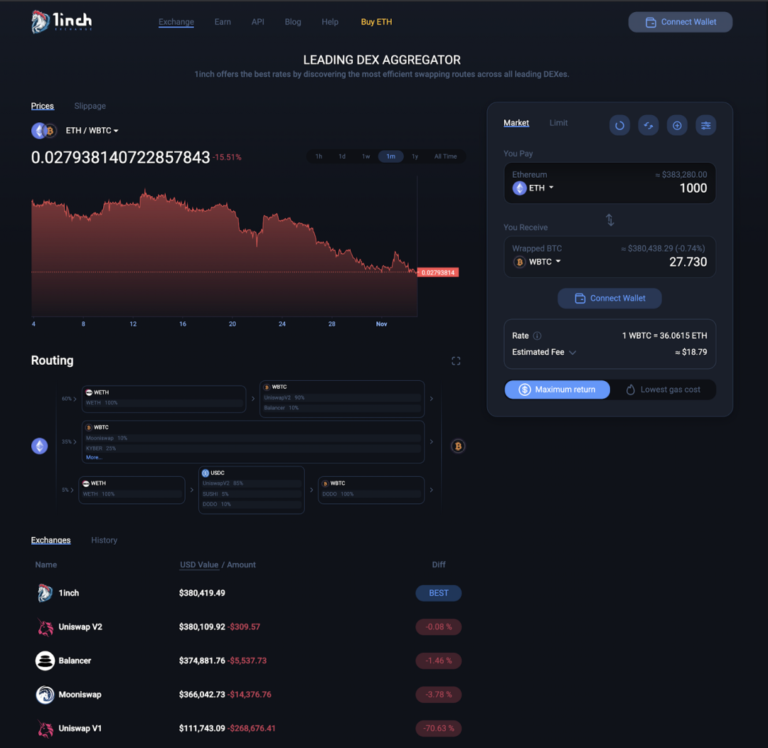 当用户在1inch上进行交换交易时,1inch确保如果其中一个协议的兑换率发生了变化,则可以很容易地取消路由的一部分。相比失败的交易,用户未交换的代币部分,会返回到他们的钱包。