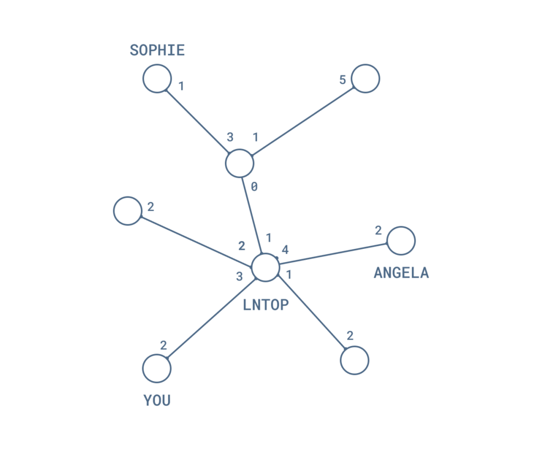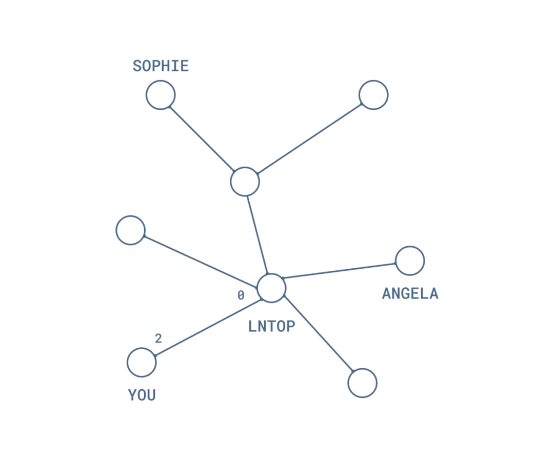 假设你想通过闪电网络来卖贴纸。那么,你需要与至少一个闪电网络节点建立连接。你仔细挑选了一个节点,保证这个节点可能跟你的潜在客户 Sophie 和 Angela 相连。我们把这个节点叫做 “lnTop”。