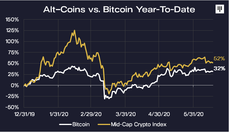 我们认为,我们目前正处于一个新的加密货币牛市周期的早期阶段,这个牛市周期将至少持续到2021年中期。经过适当的选择,即使在牛市早期,一个多元化的投资组合可以超越比特币,包括像比特币和以太坊这样的大市值货币和小市值的竞争币。今年到目前为止,我们的多币种对冲基金的表现比比特币高出约20个百分点,其基准高出约30个百分点。