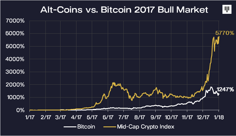 从今年年初开始,我们可以看到竞争币的表现开始超过比特币,我们预计在2020年的剩余时间里,竞争币会断断续续有好的表现。但在2021年,随着牛市的成熟,我们预计竞争币将获得比比特币更大的市场份额。下图显示了竞争币在2017年牛市中的表现。