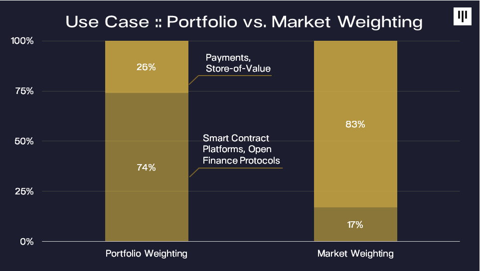 下面两个图表描述了相对于市场的比特币投资组合权重和基于用例的资产权重。