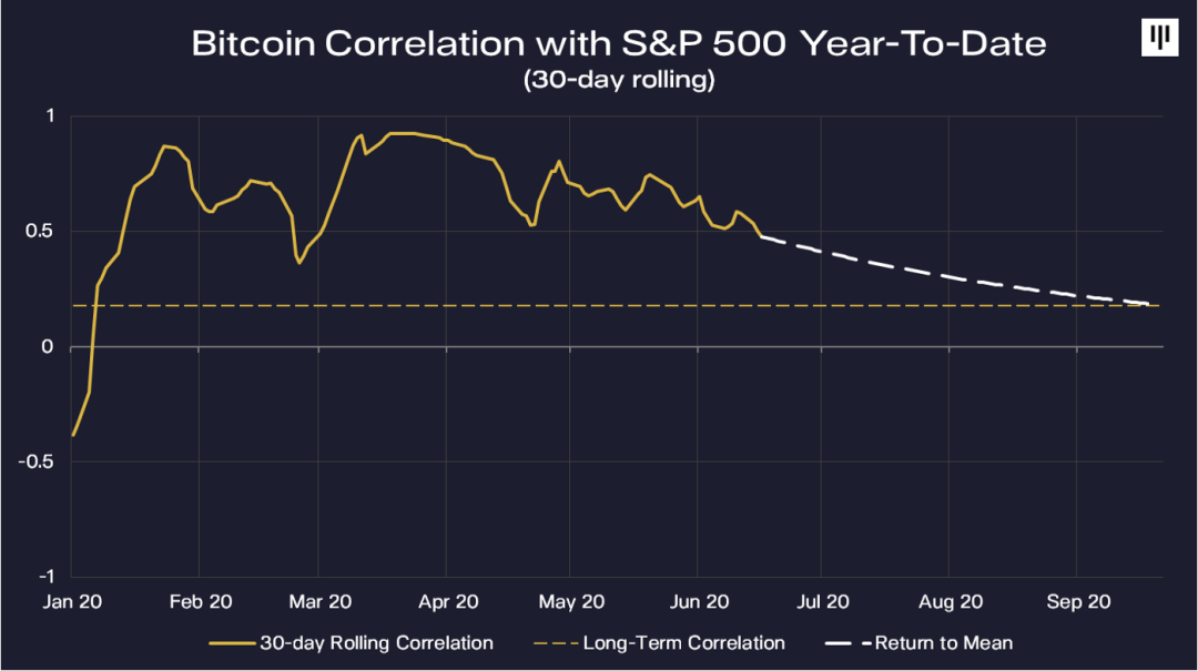 “在标普自2012年以来的五次主要下跌中,比特币与股票的相关性在最初的走势中有32天时间呈显著正相关,但在平均71天时间里逐渐趋于中性。”