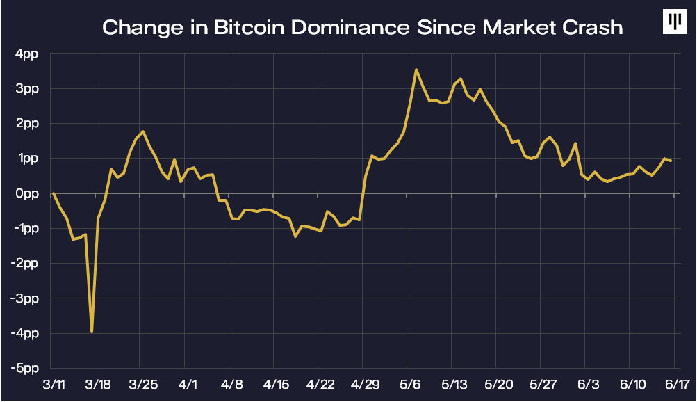 “比特币的主导地位”——比特币在整个加密货币市场的份额——在3月中旬为64.60%。该指数在5月19日达到最高点68.73%,现在回升到64.6%。我们预计它会下降,因为其他加密货币开始表现出色——如上所述。