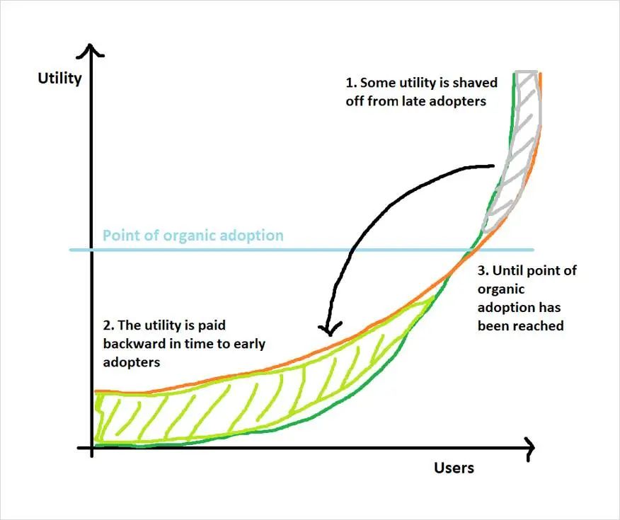 这些项目发现了一种技巧,可以将未来采用者的效用传输到早期采用者,从而在困难的早期采用阶段架起了一座桥梁。