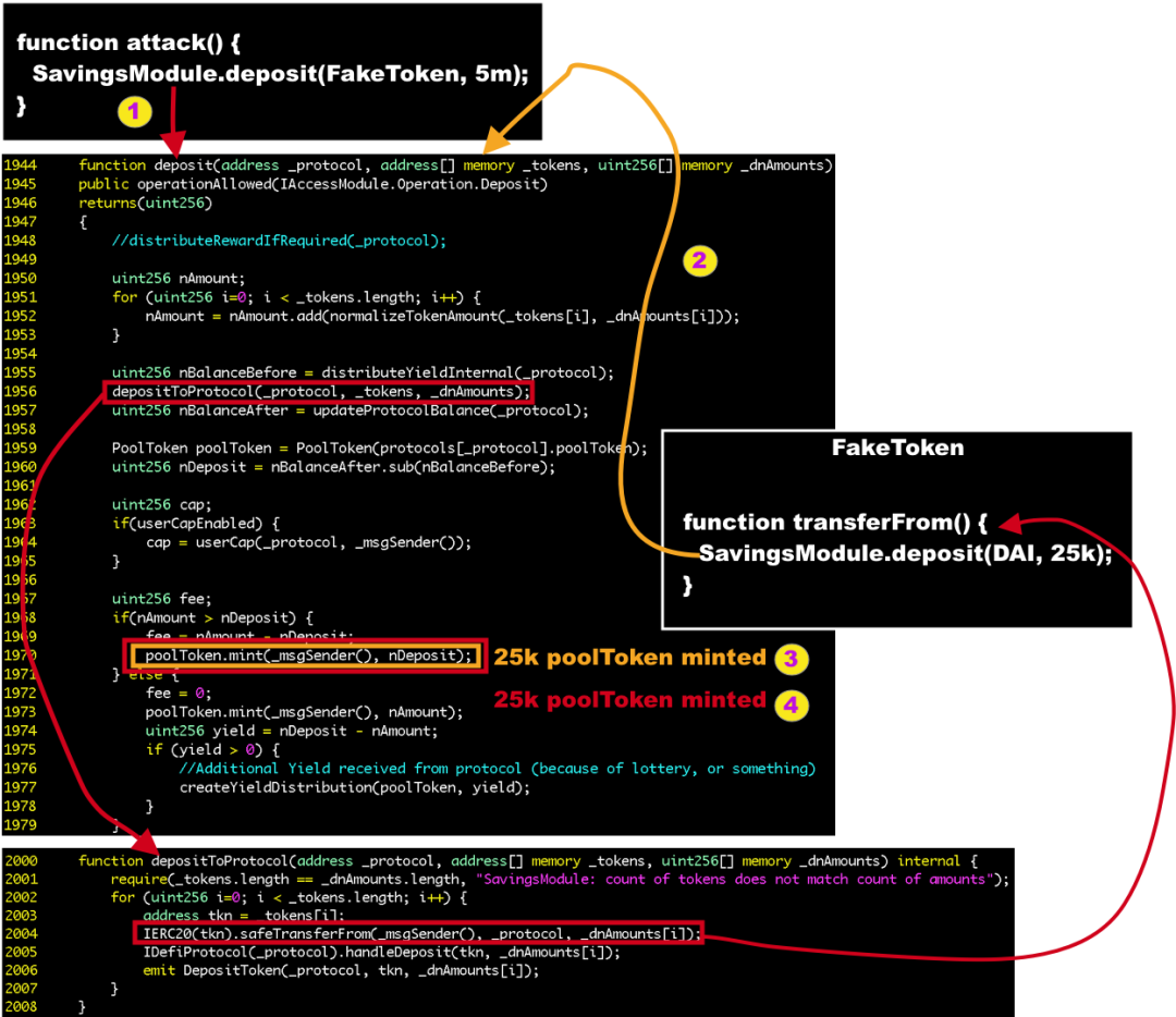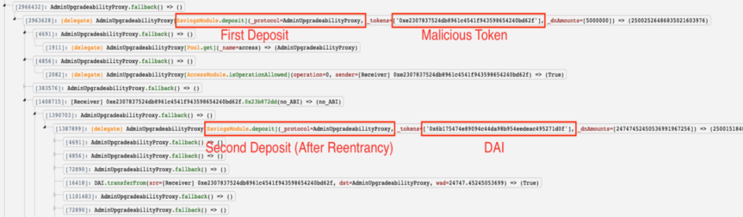 攻击者先是调用 SavingsModule.sol (https://github.com/akropolisio/delphi/blob/release-1.0/contracts/modules/savings/SavingsModule.sol#L217-L277) 中的 deposit() 函数,并将自己编写的位于 0xe230 开头的恶意合约作为要存储的代币地址传入。当其恶意代币的 transferFrom() 函数被调用时,其钩子函数会再次调用 deposit() 函数并存入真实的 DAI 资产。