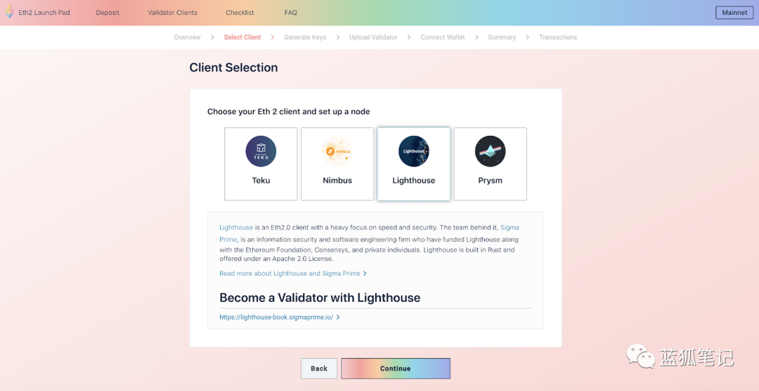 Eth2启动会有多个客户端,验证者可以选择使用不同的实现来运行验证器。截止到目前,有4个准备就绪的客户端可供你选择: