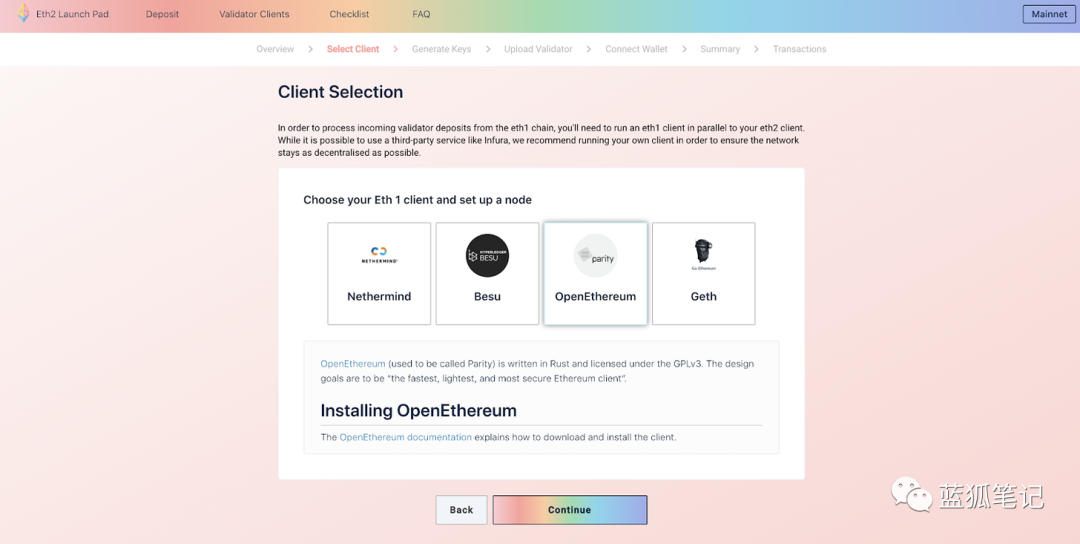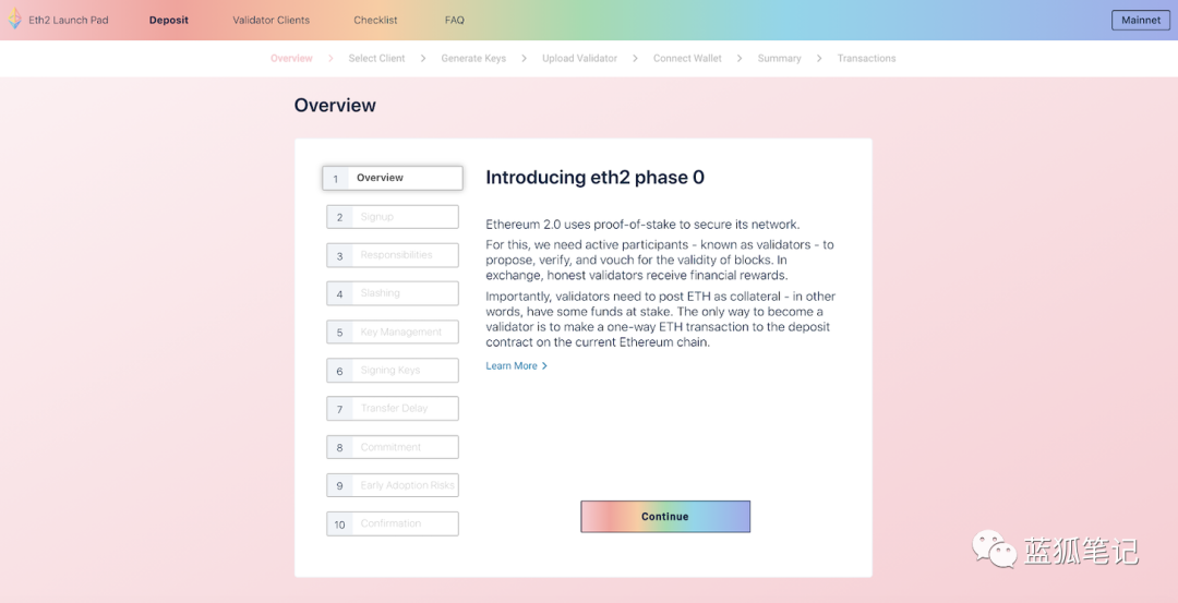 如果刚了解以太坊,首先重要的一步是获得参与的燃料。Eth2要求每个验证者32个ETH。这是真金白银!要注意,如果你成为一位验证者,意味着你对ETH2.0作出了长期承诺,可能会有几年的时间。(蓝狐笔记注:因为存入的ETH暂时不能转移,也不能退出,锁定较长时间)ETH可以通过一些中心化或DEX(如Uniswap)获得。