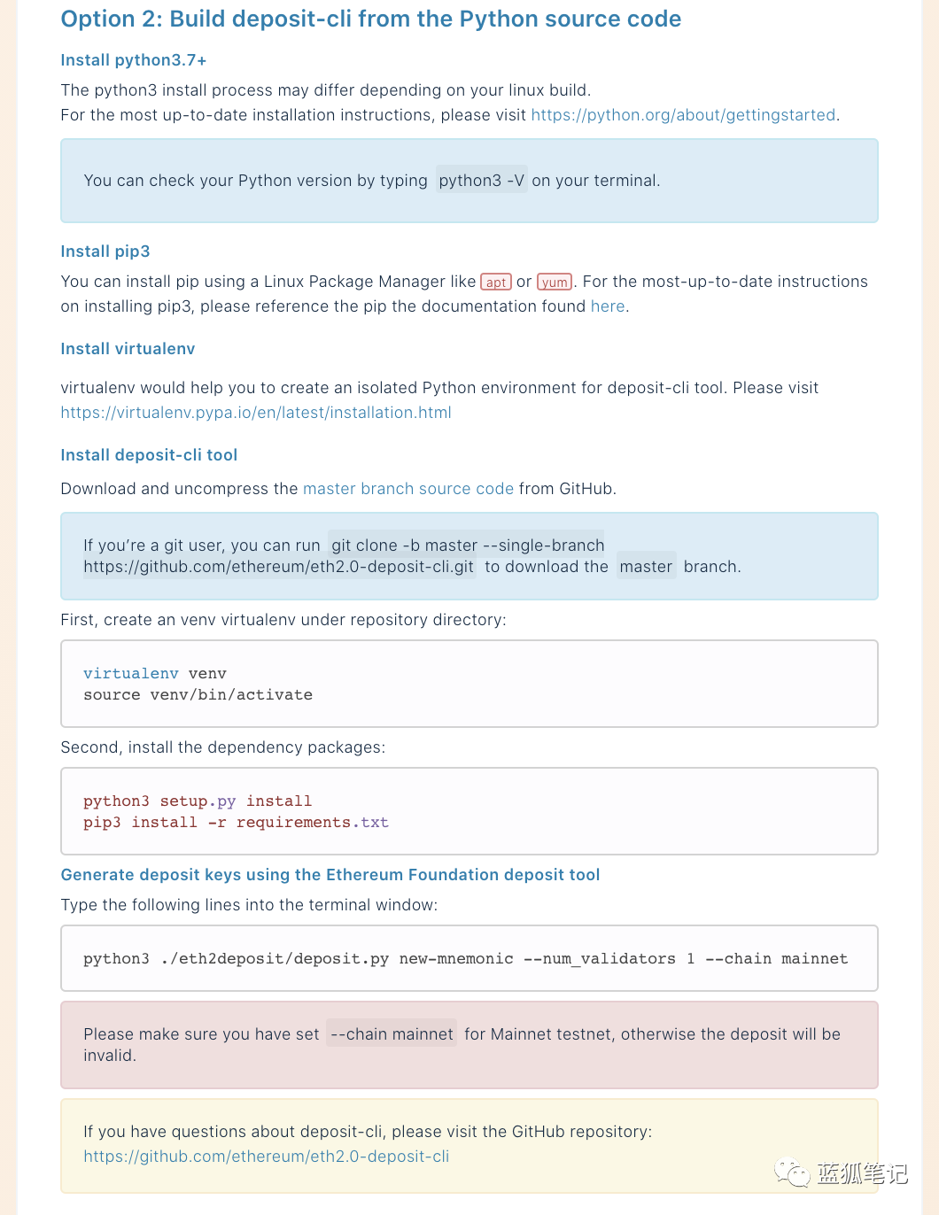 另外一个选择是从Python源码构建deposit-CLI工具。你需要遵循说明,确保已安装所有必需的开发库和deposit-CLI工具。