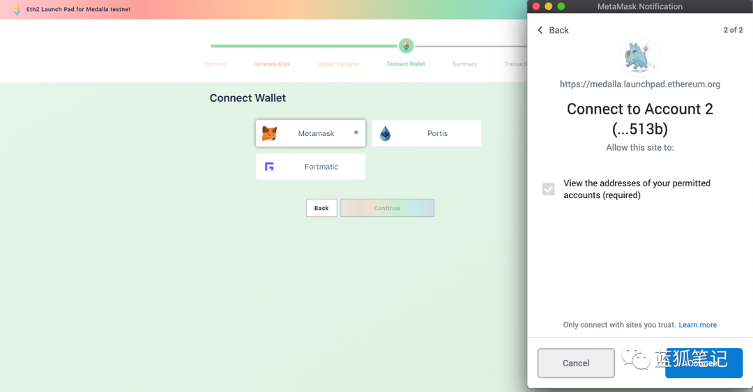 连接并确认你的钱包地址后,你将进入摘要页面,该页面根据你选择的运行的验证器数量,显示发送至存储合约所需的ETH总量。