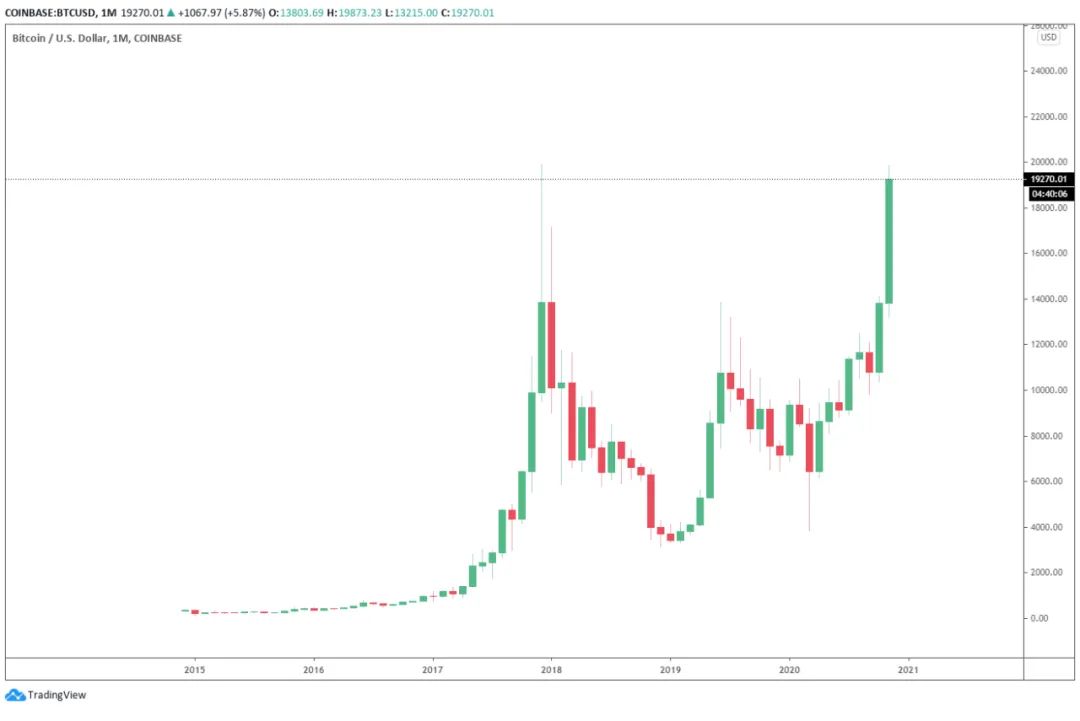 11月30日,比特币价格在Coinbase上达到了19873美元,在一次出人意料的飙升中突破了19000美元。尽管加密货币领域的许多人都在庆祝比特币创下了历史新高,但它并没有就此结束。