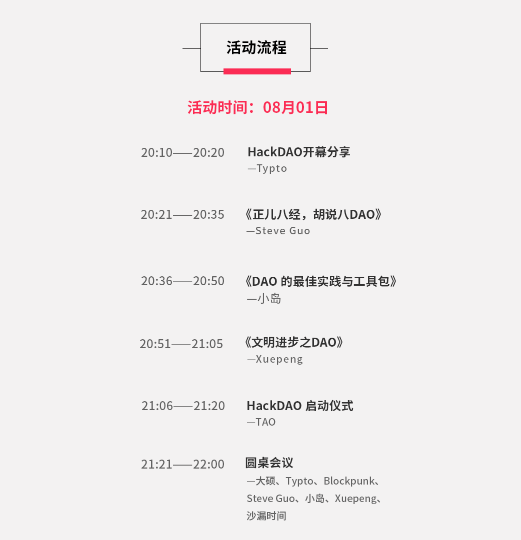 如果你想要了解HackDAO,或者已经加入其中,那么请锁定8月1日20:10黑客松开幕式,我们期待你的加入!