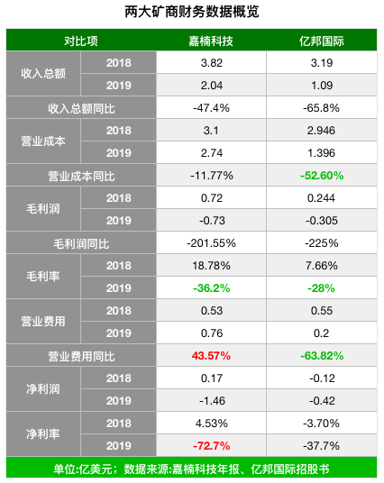两家公司最为醒目的业绩莫过于毛利(率)、净利(率)及同比等数据,无一不为负数,也即这两家公司每卖出一台矿机即宣告亏本。