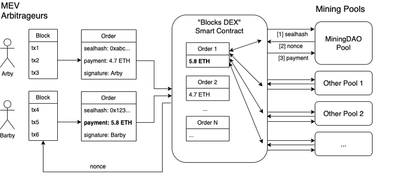 MiningDAO协议旨在促使以太坊上的区块生产透明、去信任和去中心化。最急迫的用例是矿工可提取价值(“ MEV”)。