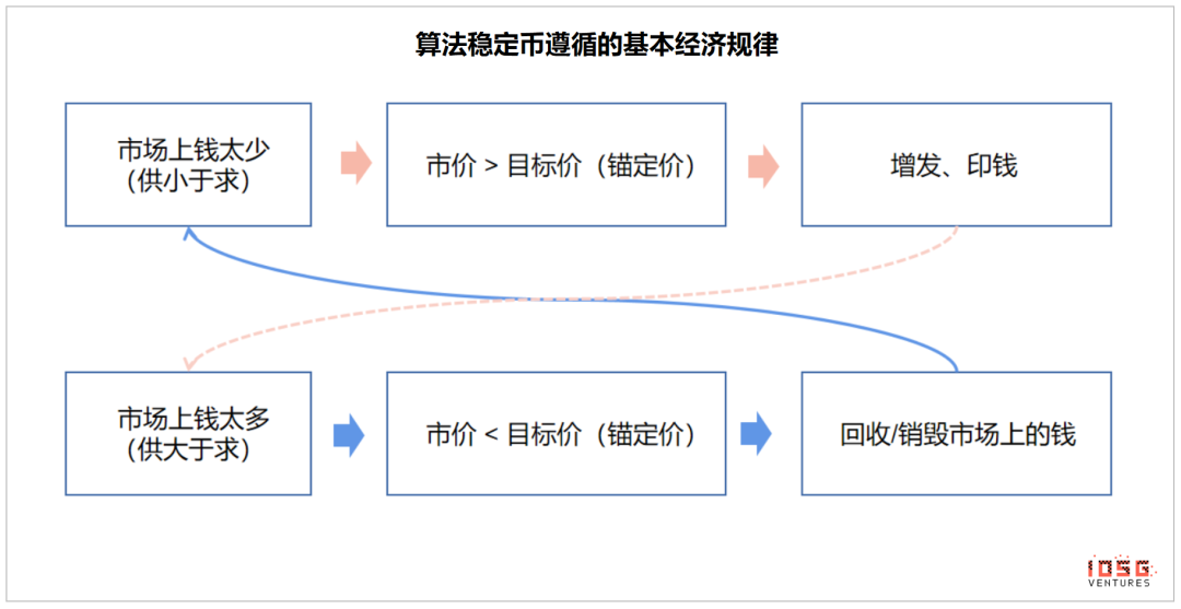 稳定币发行(目标价格、发行量)后,“市场价格/目标价格波动(供需失衡) > 智能合约全局调控/用户自发式调控 > 影响供需,传导至市场价格” 来归纳几乎所有的算法稳定币。