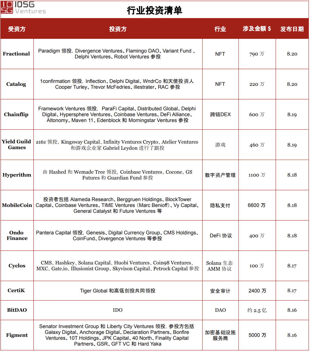 *NFT NFT 碎片化协议 Fractional 完成 790 万美元种子轮融资,Paradigm 领投,Divergence Ventures、Flamingo DAO、Variant Fund 、 Delphi Ventures、Robot Ventures 参投。Fractional 打算利用这笔资金扩大其团队,特别是在智能合约和前端开发领域。该初创公司还打算扩大其业务开发团队和内部法律顾问。Fractional 目前支持碎片化的 NFT 包括 CryptoPunks、Twin Flames、Meebits、XCOPY 和 Bored Ape Yacht Club。Fractional 是一个 NFT 碎片化协议,允许单个 NFT 或一揽子 NFT 持有者选择将其 NFT 碎片化,铸造 ERC-20 所有权代币,并自行设置代币供应数量、代币符号、初始底价等参数。碎片化 NFT 购买者可以拥有部分碎片化的 ERC-20 代币,并能够对 NFT 进行投票治理,NFT 的实际底价为智能合约治理的代币持有人所有投票的加权平均值。另外,碎片化代币将能够在 DeFi 协议上使用,例如 AMM 池、借贷平台和期权协议。NFT 音乐平台 Catalog 完成 220 万美元融资,1confirmation 领投*NFT Catalog 完成 220 万美元融资,1confirmation 领投,Inflection、Delphi Digital、WndrCo 和天使投资人 Cooper Turley、Trevor McFedries、illestrater、RAC 参投,此次融资已于 6 月下旬结束。此前由 Peter Thiel 和 Mark Cuban 支持的投资公司 1confirmation 筹集了 1.25 亿美元基金以支持加密初创公司,此次部分投资金额来源于该基金。Catalog 旨在为独立音乐家提供 NFT 服务,Catalog 表示已有 100 多名独立音乐家通过该平台销售超 21.3 万美元 NFT 音乐唱片,团队成员在过去几周从 3 人增加到 5 人,新资金将用于扩大团队。跨链 DEX Chainflip 完成 600 万美元融资,Framework Ventures 领投 *跨链 DEXChainflip 完成 600 万美元融资,Framework Ventures 领投, ParaFi Capital、Distributed Global、Delphi Digital、Hypersphere Ventures、Coinbase Ventures、DeFi Alliance、Altonomy、Maven 11、Edenblock 和 Morningstar Ventures 参投。融资资金将用于 Chainflip 的社区发展和用户支持,建立内部运营,同时扩大 Chainflip 的产品和团队。Yield Guild Games 完成 460 万美元融资,a16z 领投 *链游