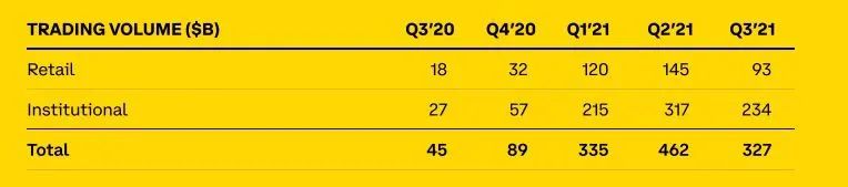 虽然没有达到市场预期,但是,其净营收中,来自于机构投资者的交易量已经与散户投资者拉开较大距离,虽然较上一季度有所下降,但整体占到了70%的份额,约有 2340 亿美元,同比增长更是达到去年的 9 倍以上。
