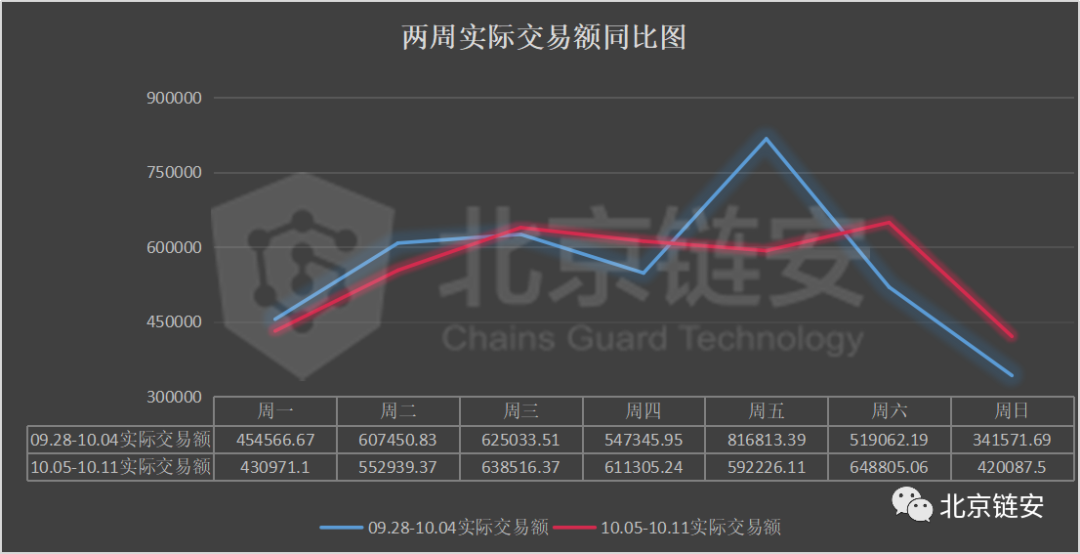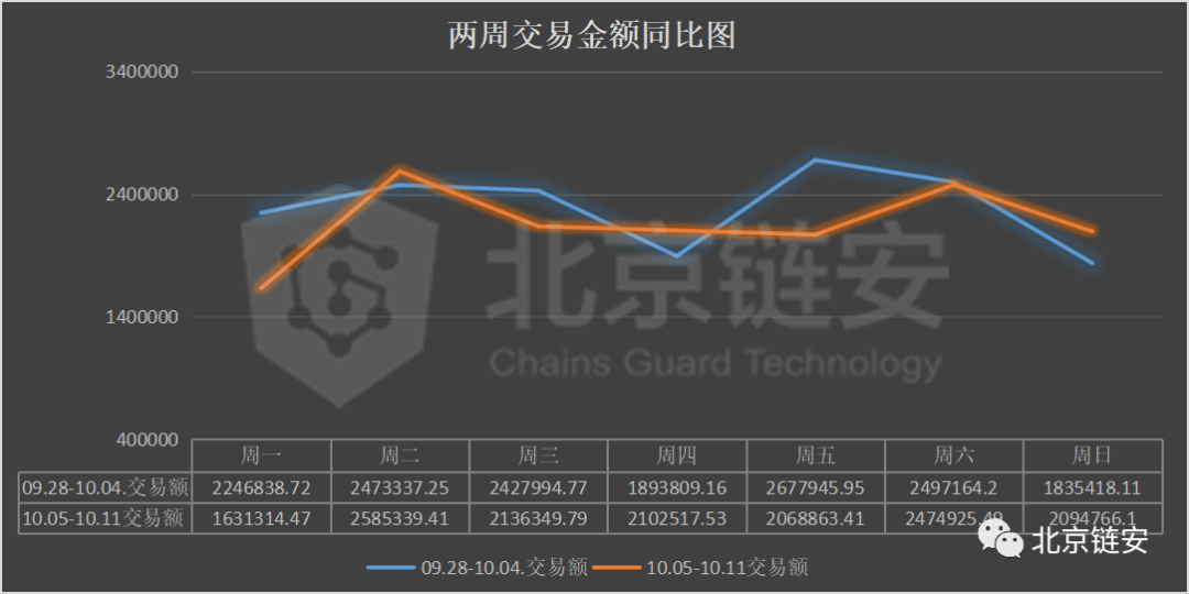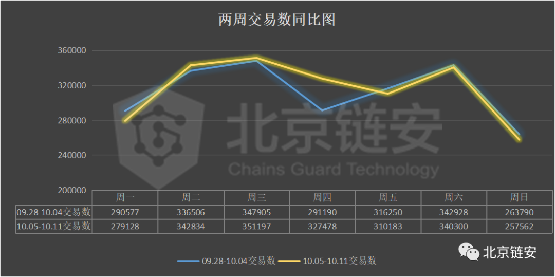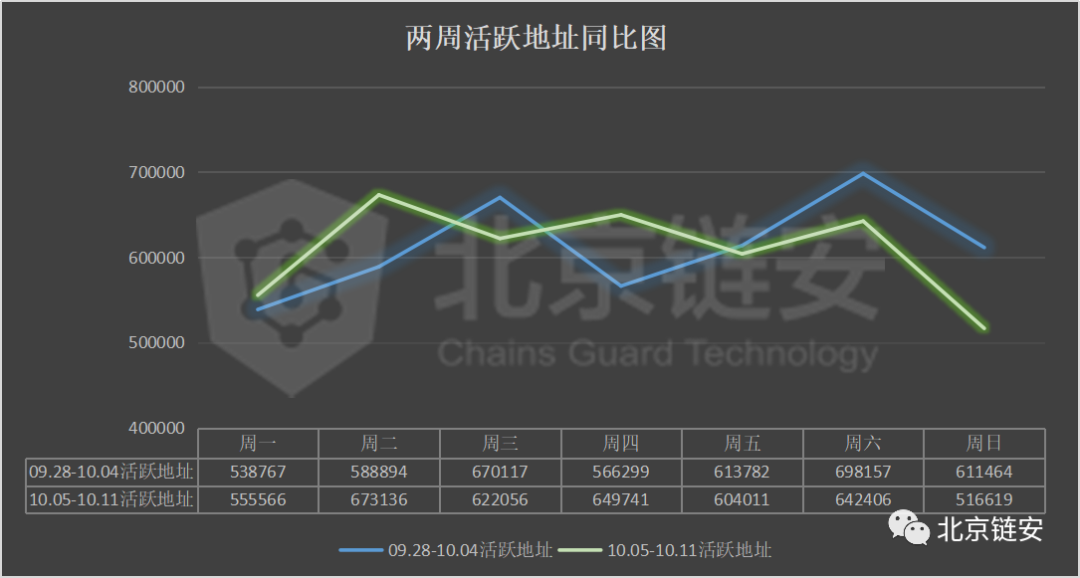 从过去一周(10.05-10.11)数据来看,链上数据较前一周相比较为平稳,大多数数据变化不大,但是与此同时交易所的各项数据都有较为明显的下降,可见在币价平淡期,结合中国长假因素,围绕交易所的链上交易出现了下滑。