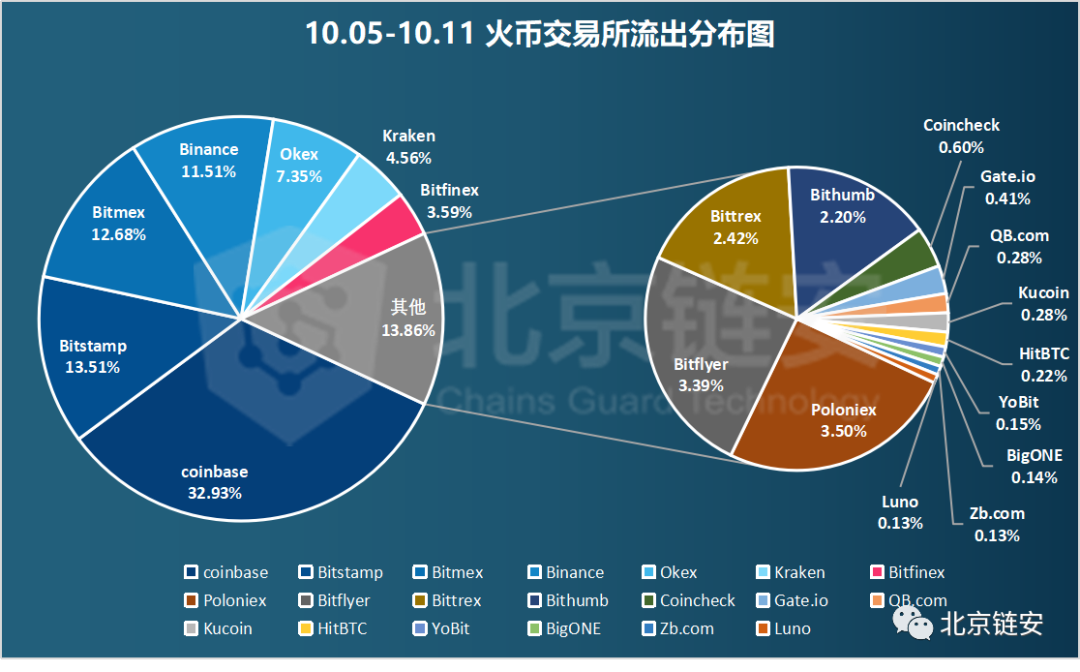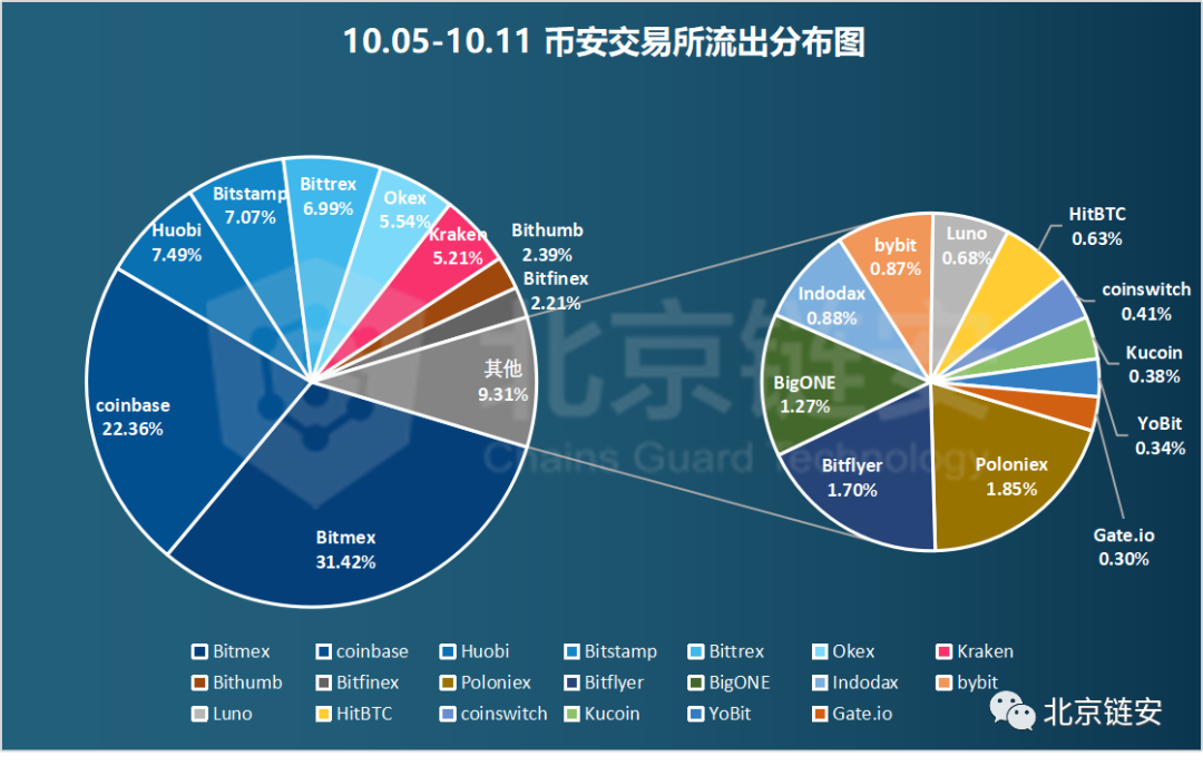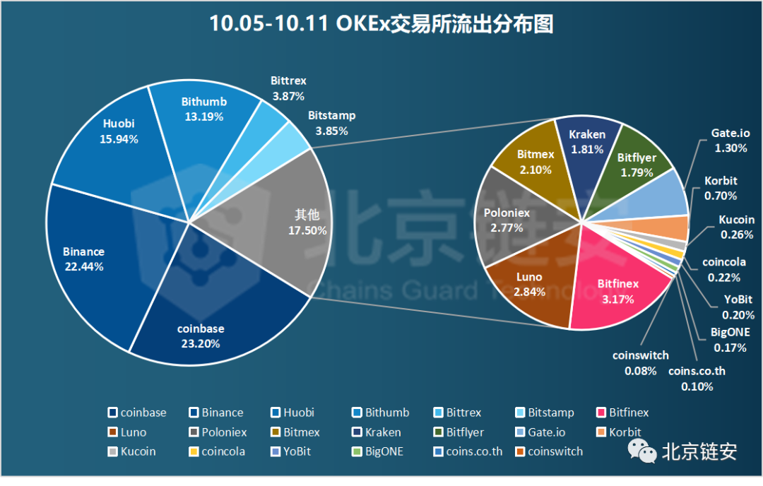在过去一周,交易所之间的比特币来往又呈现怎样的分布呢?我们将币安、火币、OKex三大交易所流出到各交易所的比例在这里也向各位呈现。