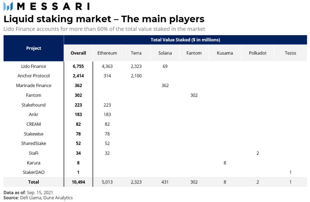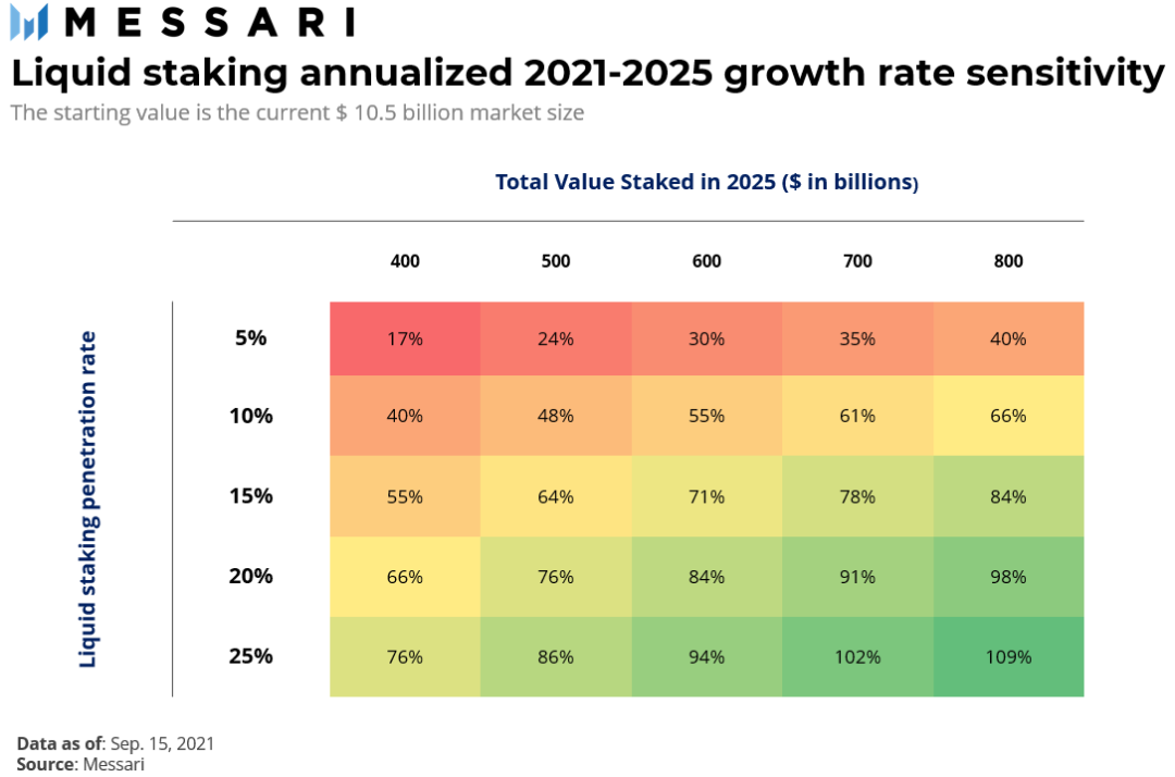 假设到2025年,staking年奖励达到400亿美元,平均staking收益率在5%-10%之间,这意味着总的质押代币市值将在4000亿-8000亿美元之间。所有质押代币当前的市值约为1460亿美元,而当前锁定在DeFi 中的总价值为 1860 亿美元(截至9月15日的数据)。很明显,随着以太坊等加密网络向权益证明(PoS)共识机制的大规模转变,流动staking可能会迎来一波相当大的市场增长。