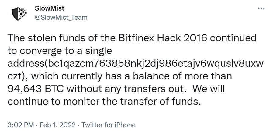 慢雾 AML 曾于 2 月 1 日监测到 Bitfinex 被盗资金出现大额异动,后被证实该异动资金正是被司法部扣押了的 94,643.2984 BTC,约占被盗总额的 79%,目前这些资金保管在美国政府的钱包地址