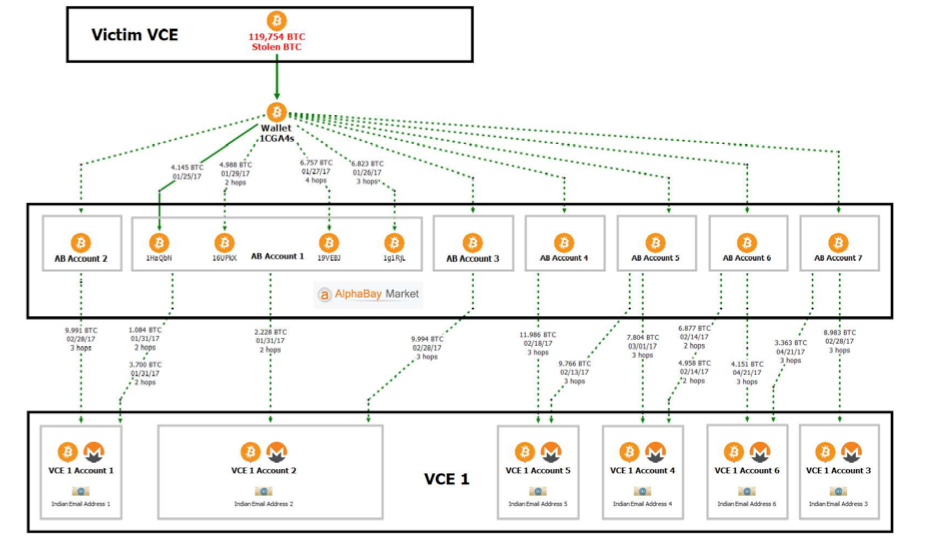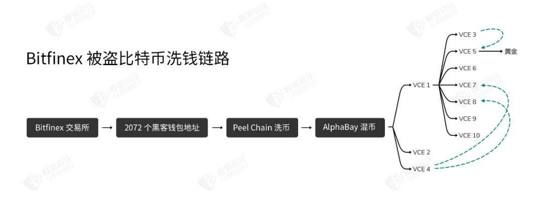 2、从 2017 年 1 月开始,被盗资金才开始转移,其通过剥离链(peel chain)技术,将被盗资金不断拆分、打散,然后进入了 7 个独立的 AlphaBay (暗网交易市场,2017 年 7 月被执法部门查封并关闭)平台账号进行混币,使 BTC 无法被轻易追踪。从结果看,使用 AlphaBay 进行混币的比特币约为 25000 BTC。