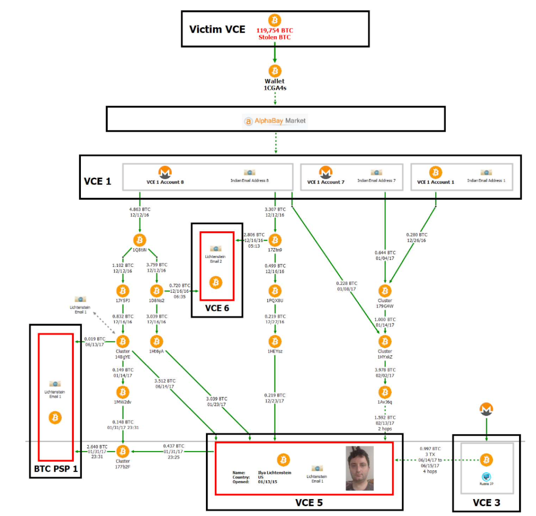 3、混币后,大部分资金被转入到 8 个在交易所-1(VCE 1)注册的账号,这些账号的邮箱都是用的同一家印度的邮箱服务提供商。除此之外,这 8 个账号使用过相同的登录 IP,并且都是在 2016 年 8 月左右注册的。更为致命的是,在 Lichtenstein 的云盘里有一份 Excel 表格,记录着这 8 个账号的各种信息,而且其中 6 个账号还被他标记为 FROZEN(被冻结)。美国司法部统计发现,交易所-1(VCE 1)里的 8 个账号共冻结着价值 18.6 万美元的资产。