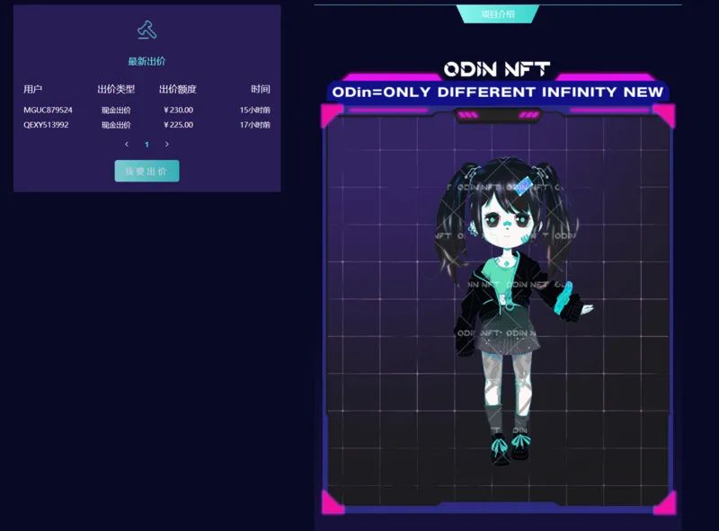 除了创作者申请上链的作品外,在原创板块,ODin也取得了一定的成绩,一个是盲盒系列和碎片化NFT,盲盒主要有“武则天系列”、“七夕鹊桥系列”,上线基本秒空。“韩熙载夜宴图滑稽猫猫版”是NFT的合成玩法,用户只要完成4个猫猫碎片的搜集,就能够获得一个完整的NFT并获得隐藏款,有用户花了320元成本凑齐了四个猫猫碎片,拍卖价出到2000多元,也有免费获得了隐藏款的用户出价到600多元,在当日便获得了超过八倍的收益。此外,Odin还独家发售虚拟偶像OO和DD的NFT公仔,在二次元板块中流动性较强,每天都在刷新出价。