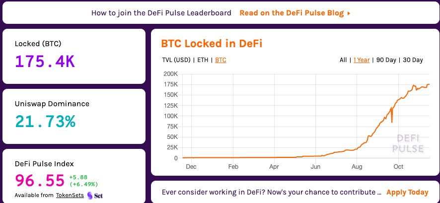 在DeFi市场上,比特币有一定的参与度。Defipulse数据显示,11月15日,锁在DeFi市场的ETH为 890万枚,现折合40.7亿美元价值;而锁仓的BTC数量为17.5万枚,折合28亿美元价值,不及ETH。