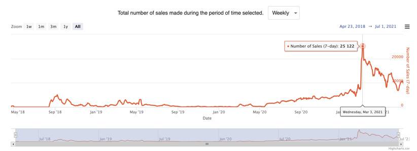 从下图可以看出,从2020年四季度开始,NFT开始进入人们的视野,NFT+体育领域启动,销售数额陡然暴涨,在3月份达到巅峰,2021年一季度整体销售额最高,二季度有所下滑,但总体都比2020年以前高出数倍,已经在一定体量的销售量上平稳维持。