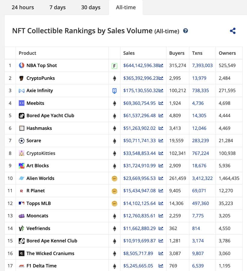 SoRare排名第7,总销量有5000多万美元,Topps排名12,总销量1400 多万美元,F1 Delta Time排名17,总销量524万美元。