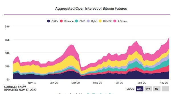 芝商所的比特币期货未平仓量于本周一(11月16日)达到9.755亿,创下有史以来最高水平。可以肯定的是,期货合约交易价值与基础商品的价格直接挂钩,因此未平仓量随比特币的价格飙升而上涨也就不足为奇了。