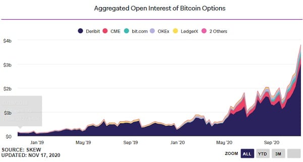 另一方面,比特币期权市场也创下历史新高,整个比特币期权市场未平仓合约总额已经达到38亿美元。作为比特币期权市场的最大参与者,加密货币衍生品交易平台Deribit截至11月17日的持仓量已经超过30亿美元,创下历史新高。