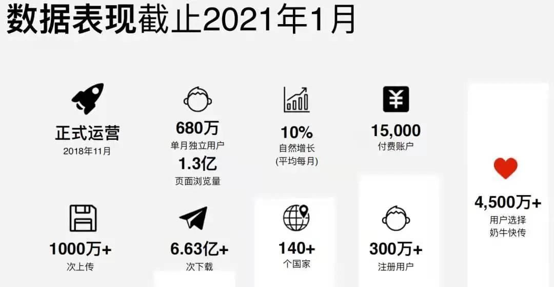 奶牛快传(cowtransfer.com)是一家提供简易文件传输与短期存储服务的产品。其无需登录即可完成文件上传下载并且上传下载永不限速,具有3T超大容量网盘空间,最大可支持20GB大文件传输,用户也可以选择免费Plan或收费Plan来适配自身需求。目前,奶牛快传已有4000万+的全球用户。