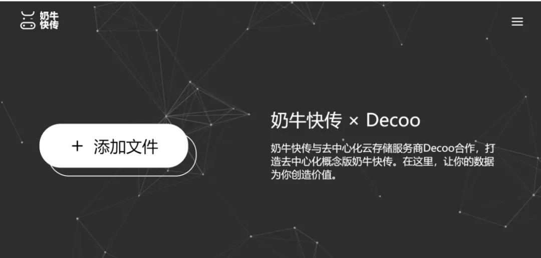 Decoo与奶牛快传的产品正在开发中,所以目前只能通过Decoo官网首页decoo.io的一个“小装置”来体验“分布式云版本的快传”是如何使用的。下图中首页的“Add File”允许用户上传本地文件到IPFS。