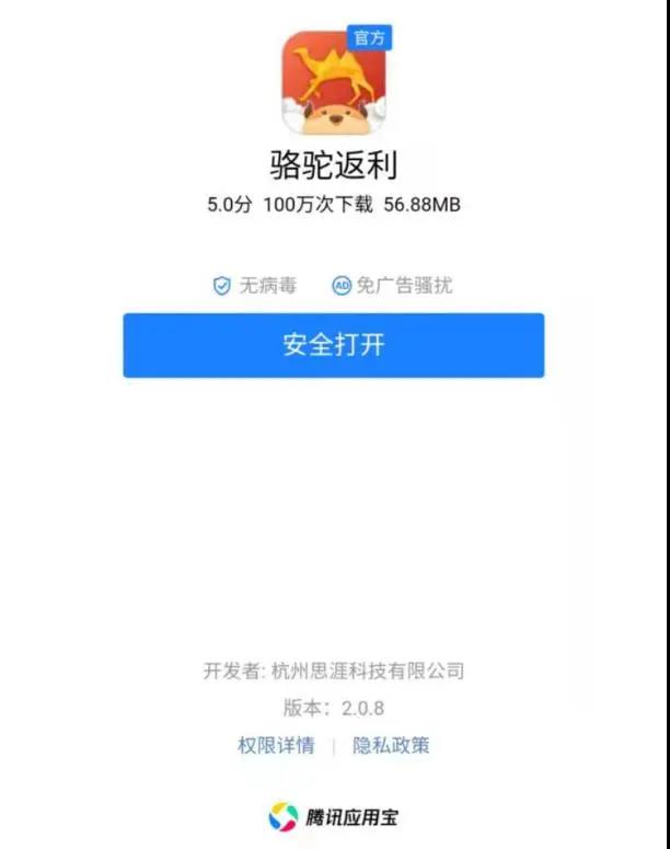 下图为骆驼返利商城的下载数据,目前App版本已更新至2.0.8,在腾讯应用宝中即可下载,下载量达100万次,评分高达5.0分。
