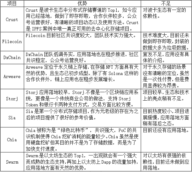 综合而言,各个项目都在为了生态的发展进行着一波又一波的技术更新,并且在分布式存储赛道中的作用各不相同,Crust目前主要致力于解决三个层次化、模块化的问题,可以提炼为三个关键字:报告、打包和服务。Filecoin致力于为大企业提供存储服务,DxChain旨在设计一个可以解决去中心化环境中大数据计算问题的平台,Arweave致力于提供数据的永久存储,Storj旨在提供可供商业级应用落地使用的方式,Sia为整个分布式存储赛道的发展奠定了一定的基础,后期出现的Chia与Swarm更是值得期待。