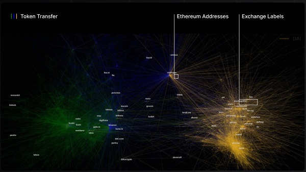 在正式进入主题之前,我们先解释一下如何理解下文中涉及的一系列图表,图表中的每一个点都代表一个以太坊地址,每条彩色线代表了代币转移,图表中也会有一些知名交易所和DeFi平台的标签注释。图上的每一行代表两个连接的用户地址,你可以想象用户线之间有一根弹簧,这些弹簧会向不同方向拉动地址,直到它们稳定下来。一组地址之间的交易越多,彼此之间在图形上的距离就越近。